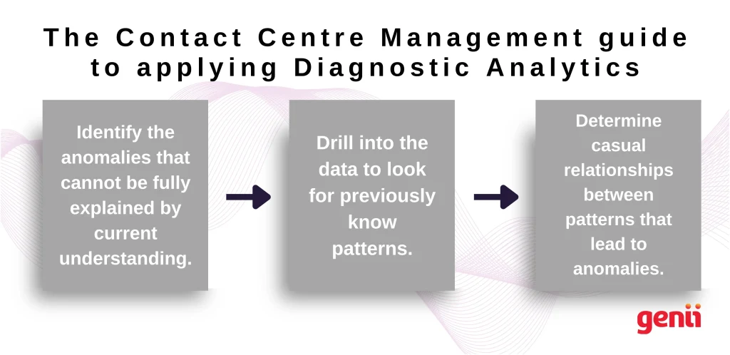Root cause analysis in its most basic form is a discipline of analysis that supports diagnostic analytics. Root cause analysis supports analysts in figuring out why a specific change or event occurred in the data. Therefore, diagnostic analytics is exactly what is required if the objective is to pinpoint the underlying causes of issues in a business and contact centre operations to determine why they developed.