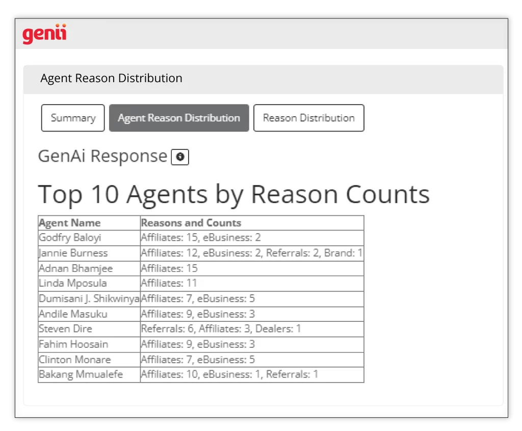 This root-cause feature surfaces and counts the primary demand type or type of outcomes by agent. It provides performance insights by identifying which agents frequently encounter problems with specific contact reasons or outcomes. This helps to pinpoint those agents who more frequently experience ongoing & underlying barriers with specific types of client engagements.