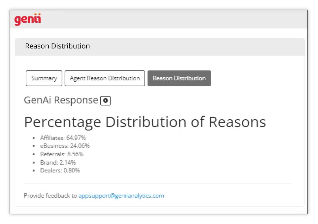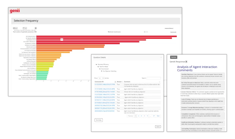 The Interaction Dashboard’s Selection Frequency section includes a Gen-Ai Summary feature. It summarises comments and themes based on the most selected root causes, offering detailed analyses of key issues. Additionally, it helps build and refine new root causes, including understanding those categorised as Not Listed or Other.